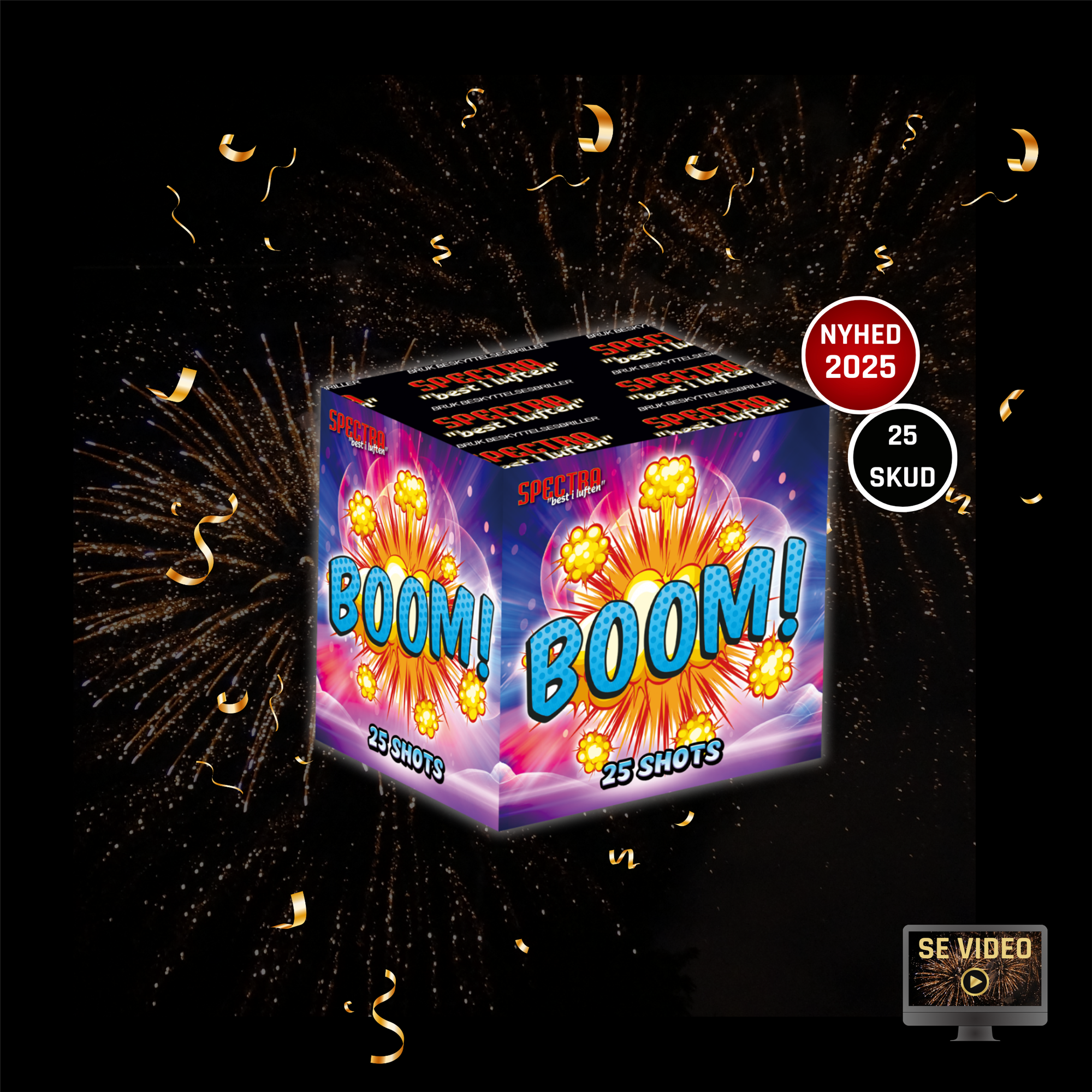 Oplev et vildt farveshow med “Boom” – et kompakt, men kraftfuldt batteri, der leverer 25 spektakulære skud af crackling, sølvhaler og farverige perler.