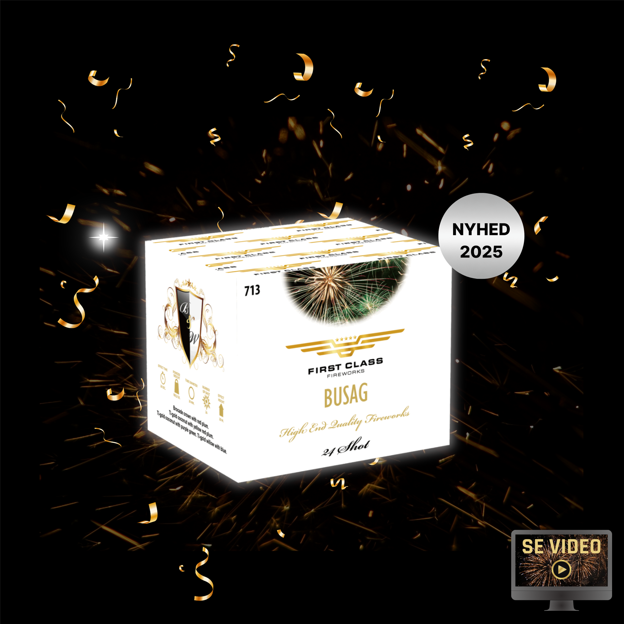 Busag er et 20 mm 24 skuds batteri, der fylder himlen med spektakulære guldbomber, ghost-effekt og en imponerende vinkelfinale. Perfekt til et elegant og dramatisk fyrværkerishow.