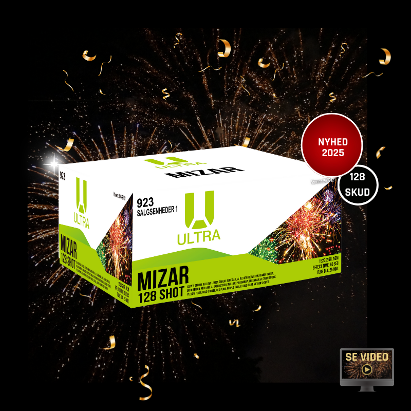Ultra Mizar er et kraftfuldt compound-batteri med hele 128 skud, udviklet til dig der vil have et konstant og energisk show, hvor der altid sker noget på himlen. Med 1523 g NEM er batteriet designet til høj ydelse og et tæt pakket forløb fra start til slut.