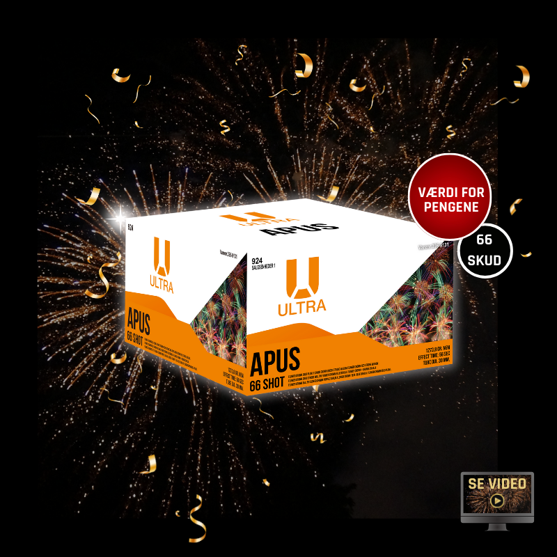 Ultra Apus er et 30mm compound-batteri med 66 skud, udviklet med ét klart formål: at levere en ultimativ guld-finale. Batteriet er ikke bygget som et langt opbygningsshow, men som et målrettet finale-batteri, hvor intensitet og visuel gennemslagskraft er i centrum.