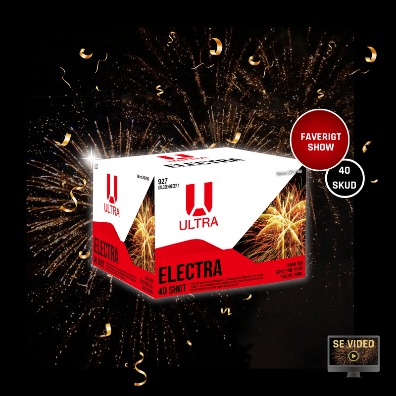 Ultra Electra er et 30mm compound vifte-batteri med 40 skud, udviklet til at levere bredde, højde og massiv fylde i ét samlet show. Kombinationen af compound-opbygning og vifte-affyring betyder, at skuddene affyres i et sammenhængende forløb, samtidig med at de breder sig markant ud over himlen.