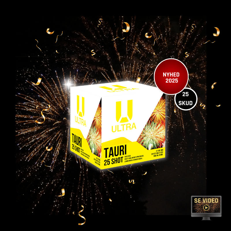 Ultra Tauri er et 30mm kvalitetsbatteri med 25 skud, udviklet til at levere maksimal effekt pr. affyring. Den store kaliber giver højden og fylden, mens guld-titanium effekterne skaber et dramatisk og luksuriøst udtryk på himlen.