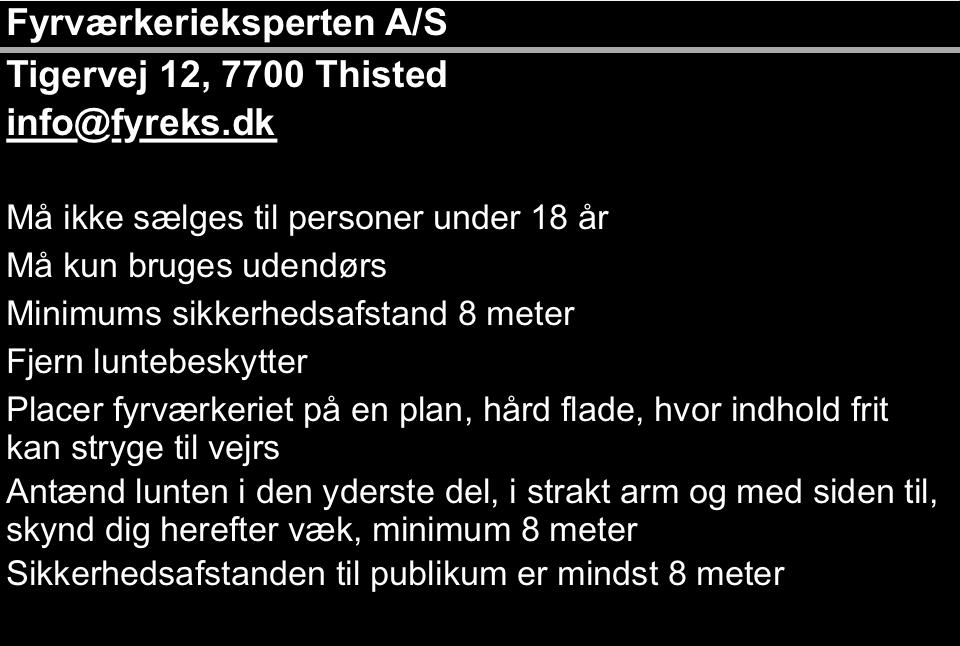 Alt vores fyrværkeri er nøje udvalgt fra pålidelige leverandører og lever op til høje krav om kvalitet og sikkerhed. Produkterne er designet til at skabe flotte lys- og farveeffekter, der gør din nytårsaften både festlig og mindeværdig.