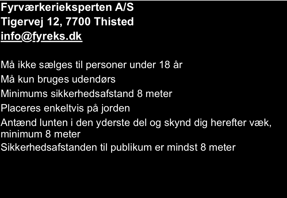 Alt vores fyrværkeri er nøje udvalgt fra pålidelige leverandører og lever op til høje krav om kvalitet og sikkerhed. Produkterne er designet til at skabe flotte lys- og farveeffekter, der gør din nytårsaften både festlig og mindeværdig.