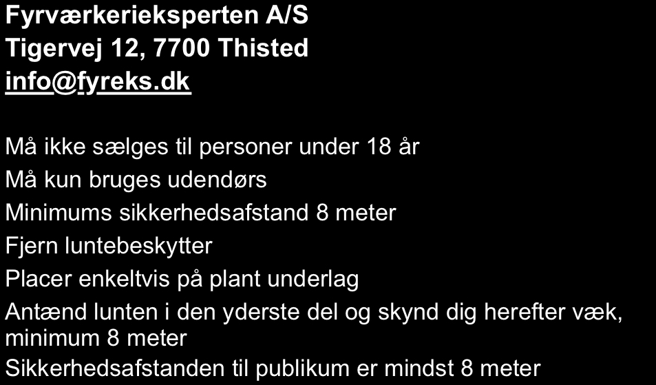 Alt vores fyrværkeri er nøje udvalgt fra pålidelige leverandører og lever op til høje krav om kvalitet og sikkerhed. Produkterne er designet til at skabe flotte lys- og farveeffekter, der gør din nytårsaften både festlig og mindeværdig.