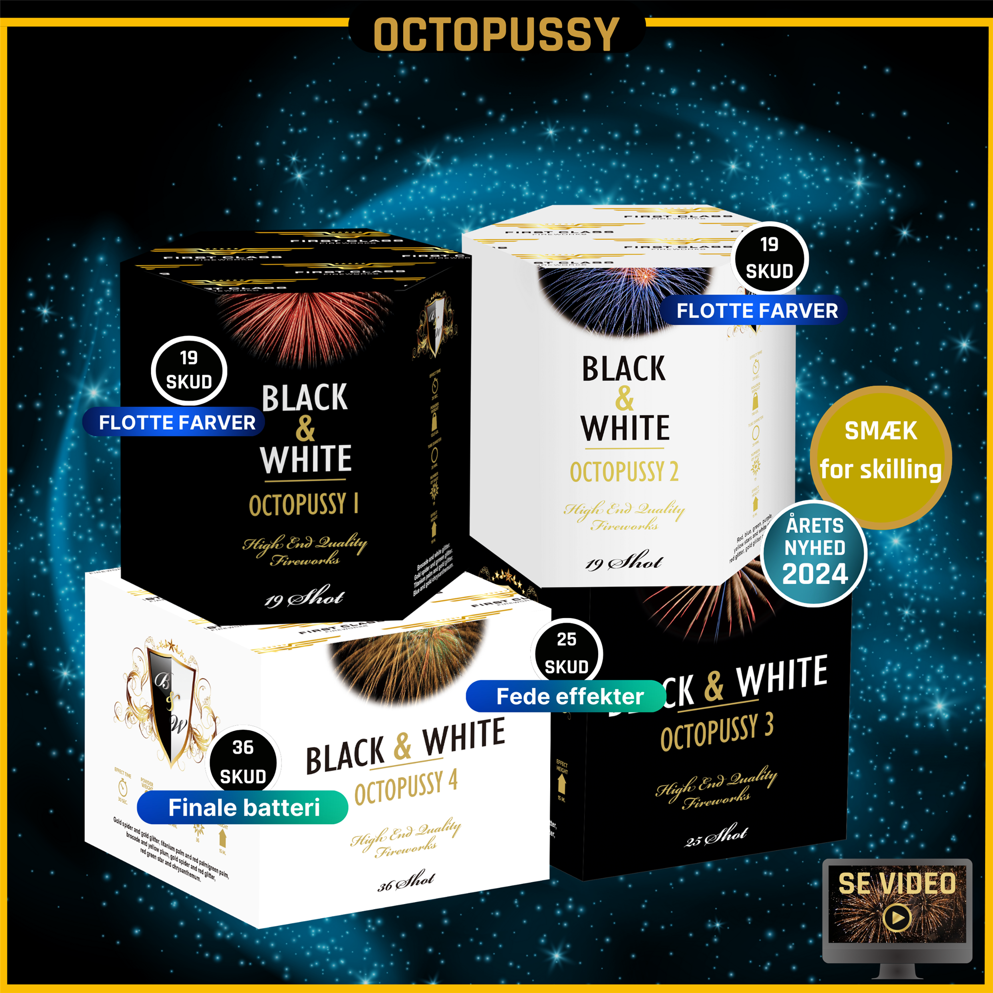 Nyd et spektakulært fyrværkerishow med Octopussy Batteri Sortiment! Med hele 99 skud fordelt på 4 fantastiske batterier får du en eksplosion af farver og effekter, der garanterer wow-faktor til enhver fest. Med en samlet krudtvægt på 619 gram leverer Octopussy sortiment alt, hvad du behøver for at skabe en uforglemmelig aften til nytår.