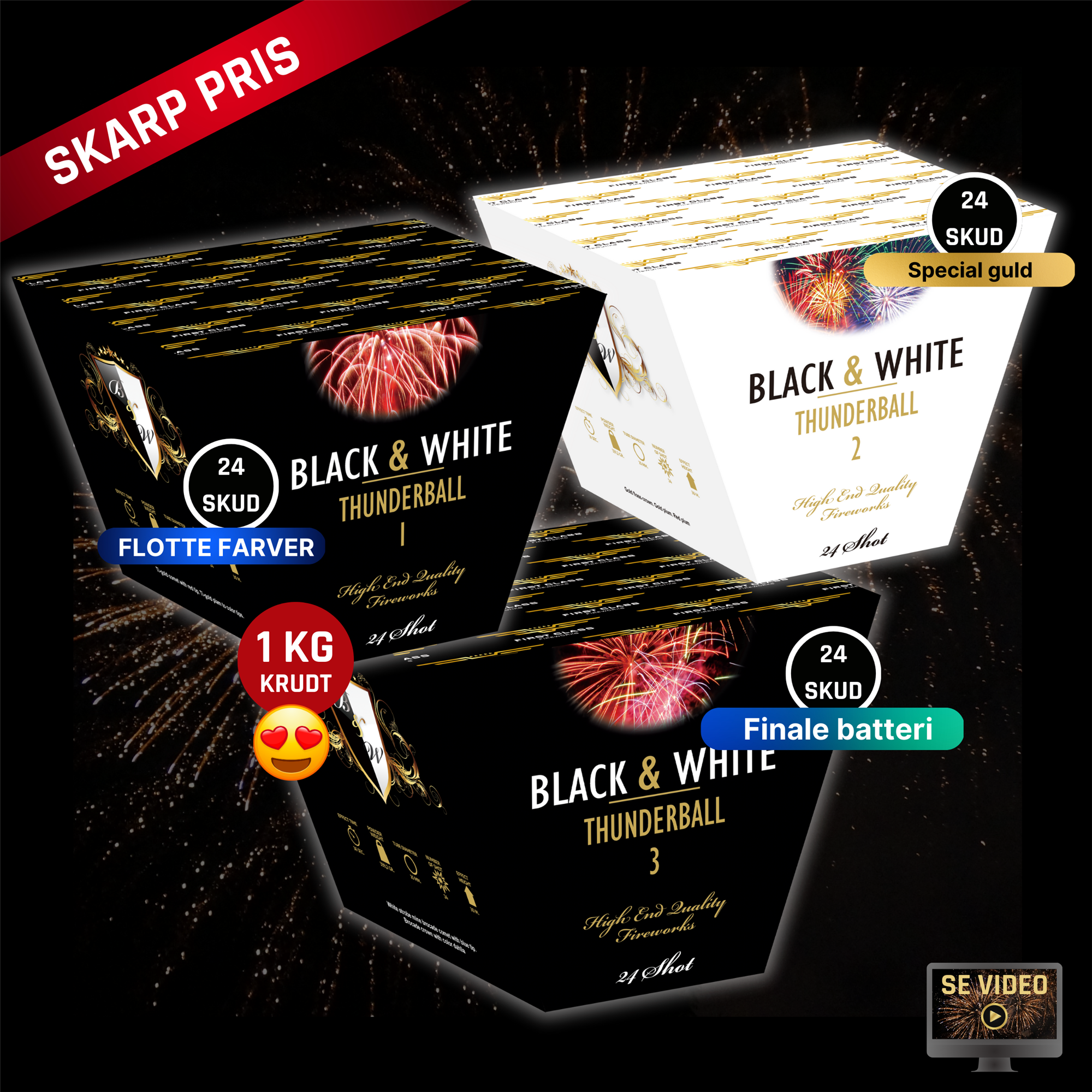 Vores imponerende Thunderball sortiment præsenterer tre fortryllende 24 skuds nytårs batterier, hver med sit unikke tema og raffinerede guld-effekter.